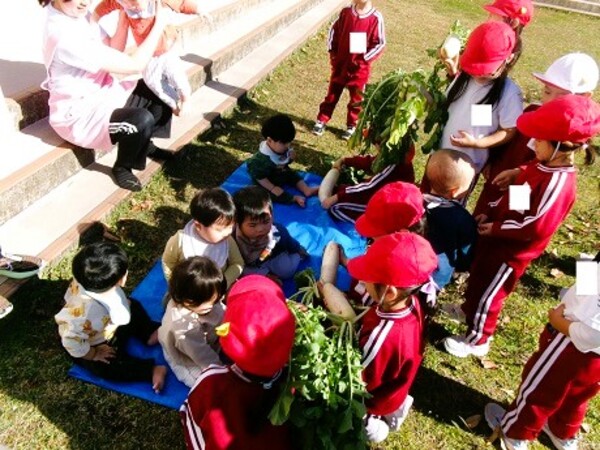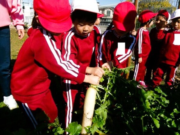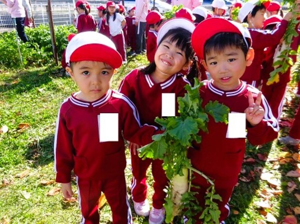 年中組の子ども達に「幼稚園の畑には今何がなっていると思う?」と聞いてみると、「だいこ〜ん!!」と元気に答えてくれました♪みんな大正解◎