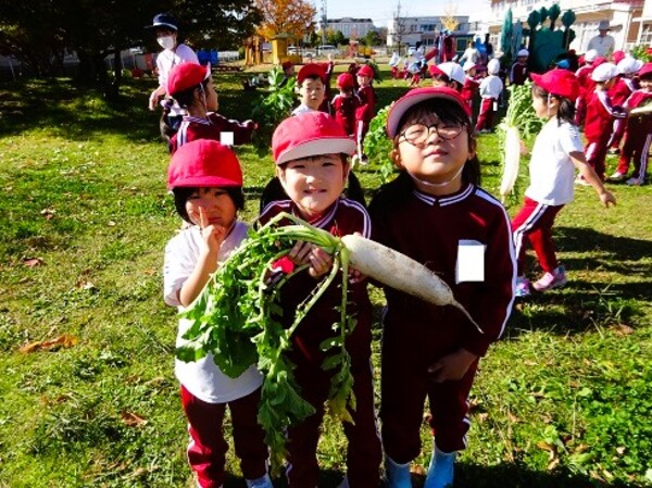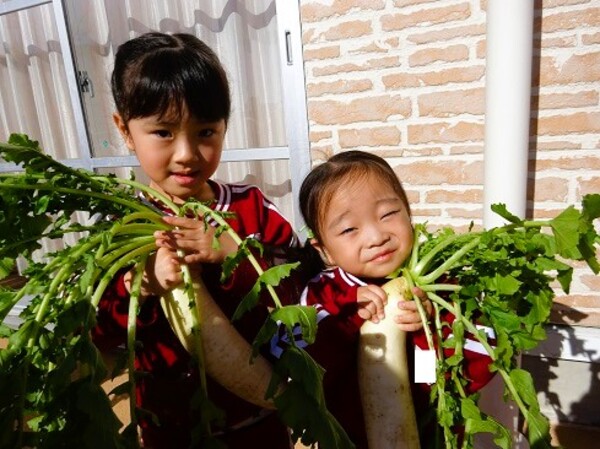 自分達で収穫したのがとても嬉しかったようで、「おおき〜い!」「おもいよ〜!」と言いながらもずっと大事に大根を持っていました。