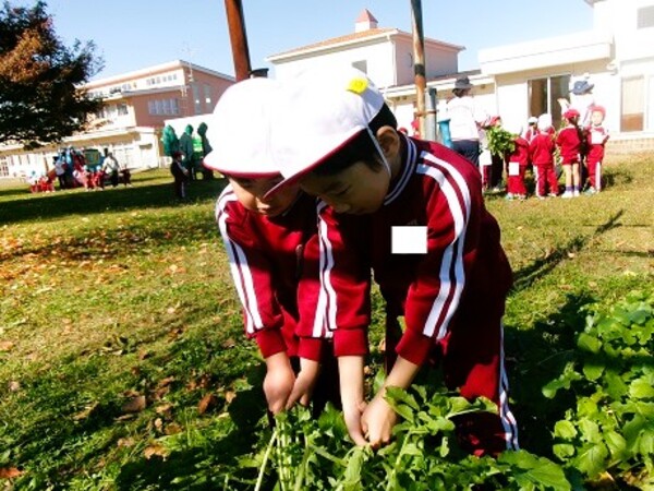 マハヤナファームでは大根の食べ頃を迎えました!園士の後藤さんから教えていただきながら年中組さんが大根の収穫にチャレンジ!