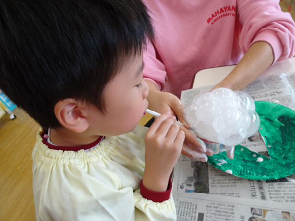 絵の具でオリジナルの緑色を作って塗り、その後、初めてのバブルアートに挑戦‼息を吹くとたくさんの泡ができて大興奮の子どもたち❣「わあ〜!すごい!」「この泡おおきい〜!」ととっても楽しんでいました😊泡が乾くと素敵な雪模様になりましたね。最後に毛糸とスパンコールで飾り付けをして完成✨