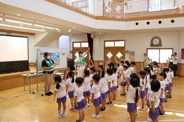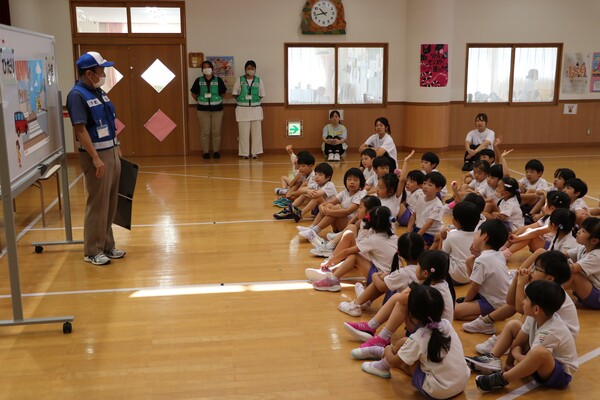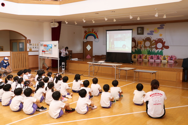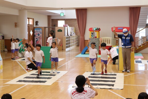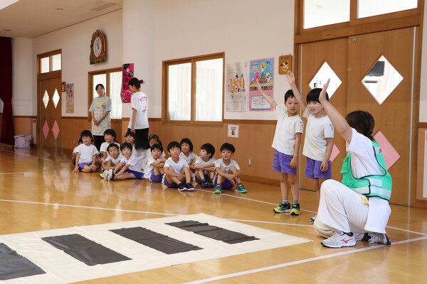 上越市の交通安全指導員の方が3名来園し、道路を歩行する際の交通ルールについてみんなで一緒に学びました。