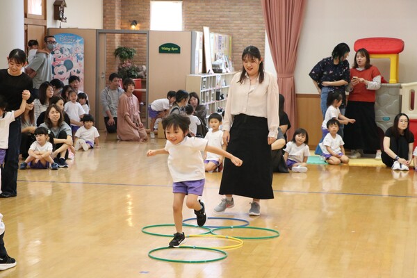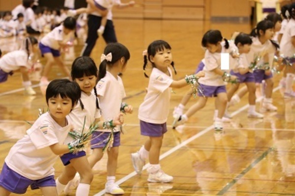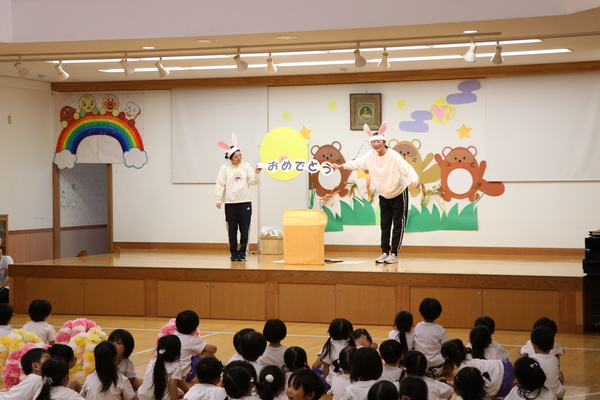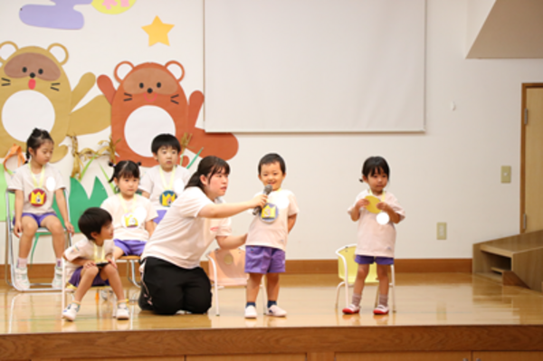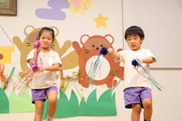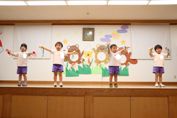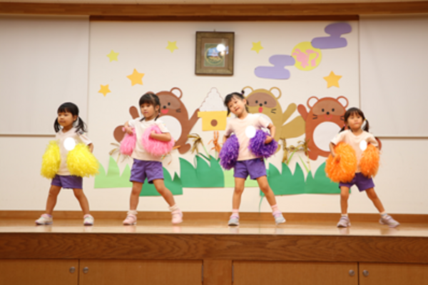 次は、みんなで季節の歌「とんぼのめがね」「おさるくん」を歌った後は学年ごとに踊りを披露しました。年長組さんは「はい よろこんで」、年中組さんは「GO!GO!サンシャイン」、年少組さんは「ハッピー・ジャムジャム」、もも組さんは「森のくまさん」を元気いっぱい踊ってくれましたね。お友達や先生たち、お家の方に見守られながらステージの上で堂々と踊ることができてとても素敵でした!