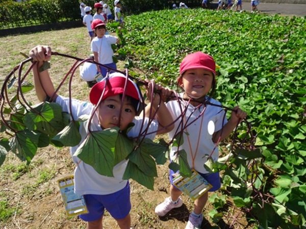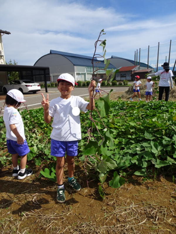 途中、さつまいも畑に立ち寄り、さつまいものツルや葉っぱを観察しました!!「大きくなっている!!」「ツルなが〜い!!」と5月の苗植えから生長しているさつまいもに大喜び子ども達!来週には、いよいよさつまいも掘りをする予定なので、「おいも育っているかな…?」「早くおいもほりしたいな〜!!」と今からワクワクしているみんなでした♡