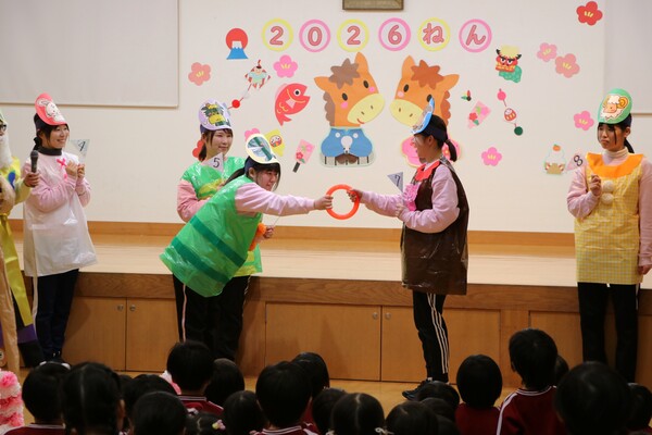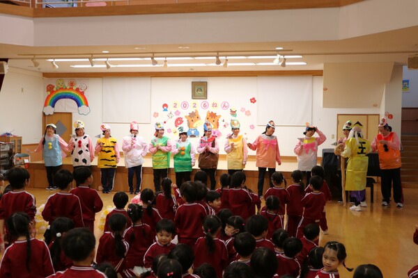 冒頭では、干支の由来について、先生たち扮するかわいい動物たちが寸劇を繰り広げました!ねずみさんは牛さんの背中に乗ったり、お猿さんと犬さんは競いながらゴールを目指したりと、それぞれいろんなドラマがありましたね☺