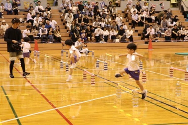 次の出番は、「障害物レース」!まずは、ポックリに乗ってバランスを取りながら歩くところからスタート!初めは上手く乗れない子も多かったのですが、日々楽しみながら沢山練習してみんな上手に乗れるようになりました😆そして、カードをめくって描いてある、鉄棒、マット、平均台の中から技を披露!華麗な前回りや素早いバランス歩きを見せてくれましたね!!そして最後にハードル走!こちらも年長さんらしいスピード感のある走りでした!!最後はみんな笑顔でゴール!どの種目もかっこよく決まっていましたね✨