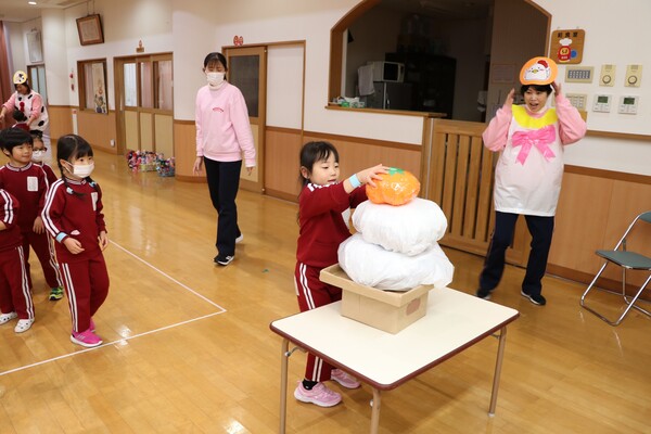 豆まきの後は、鬼じゃんけんや、豆取りリレー、節分バスケットなど、節分にちなんだゲームをお友達や先生と楽しみました。