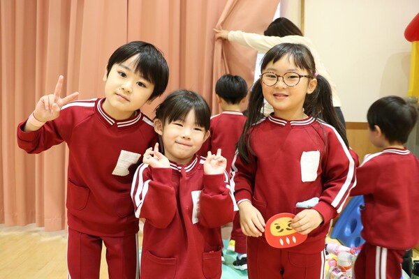 年長組は、鬼のお面をつけた先生たちがカゴを背負い、追いかけ玉入れをしたり、もも組は、バスケットゴールを鬼に見立てて玉入れを楽しんだり、年中組は、自分で描いた鬼の絵に、年少組は、先生が作った鬼に向かって元気いっぱい投げました。「鬼は〜外!」「福は〜内!」と、どの学年からも大きな声が聞こえてきて、子ども達の気合いもバッチリです!!