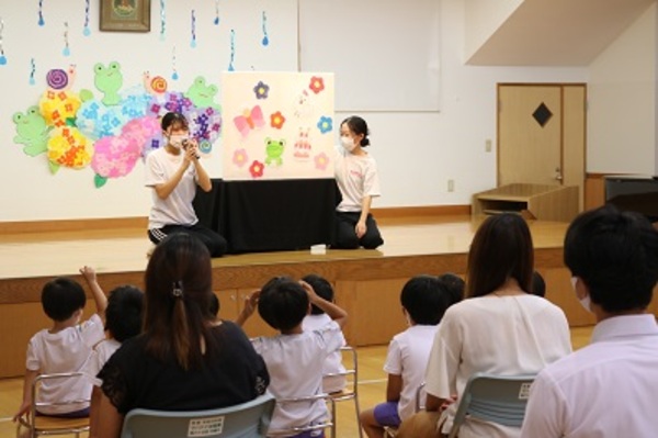 人形劇では、「もったいなーい」とみんなで声を合わせ、森の仲間たちと一緒に無駄遣いが大好きな「モンモン」をやっつけ、○×クイズでは地球環境を守るためにはなにができるのか、クイズに参加しながらみんなで一緒に考えました。