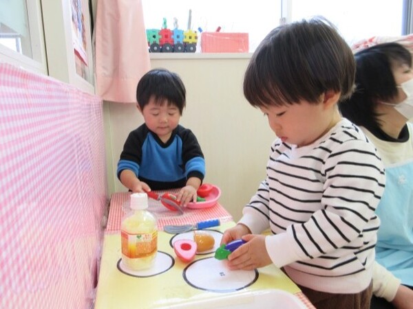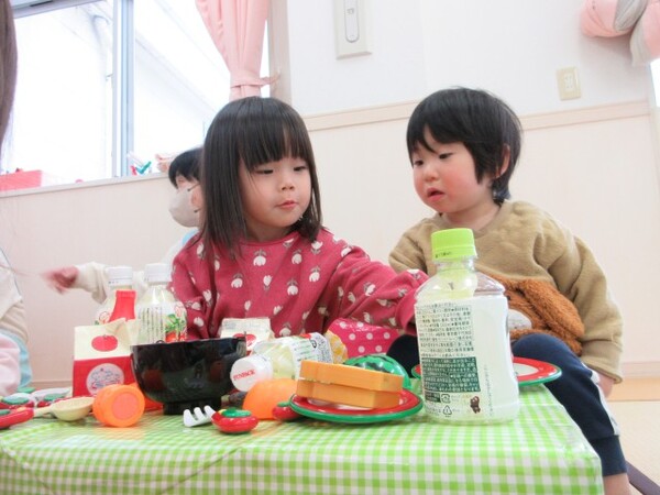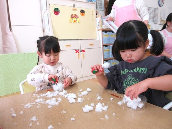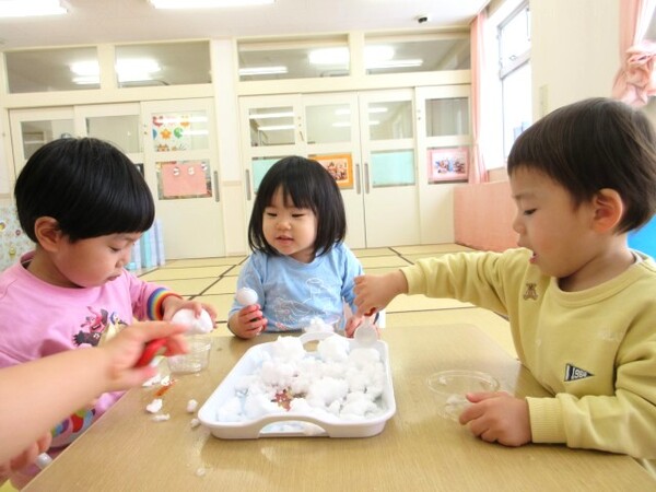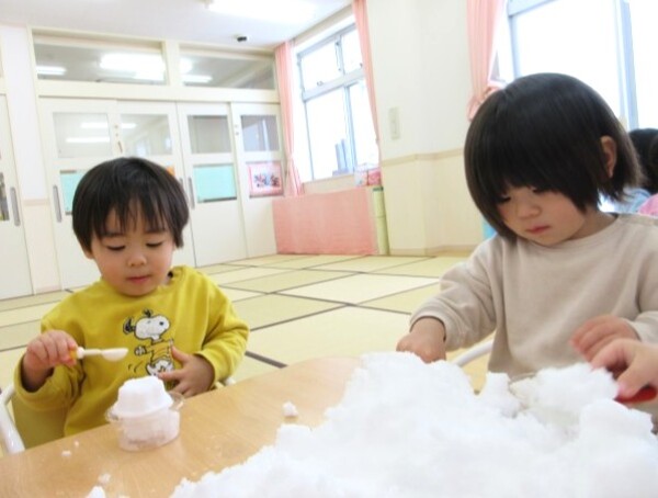 保育室で楽しんだ雪あそびの時も「お花のゼリー!」「ケーキ作ったの🎂」とおままごとごっこに夢中で遊んでいましたよ👀✨