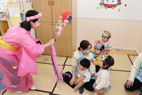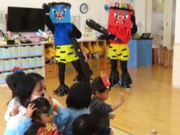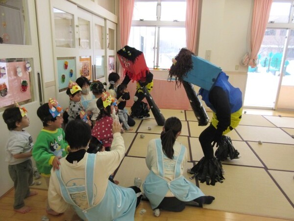 『泣き虫オニ😢』『イヤイヤオニ』『ごはん好き嫌いオニ』…みんな思い思いの心のオニをやっつけようと「おにはそと〜」「ふくはうち〜」と大きな声で新聞紙で作った豆を投げていた子どもたち。そこへ、赤オニと青オニが登場👀✨大迫力のオニたちにドキドキして涙がこぼれてしまう子、涙をこらえながら豆を投げる子…一人ひとりが頑張ってオニ退治をしました。オニが帰った後、福の神さんが春を運んできてくれると、涙も止まり、福の神さんと触れ合い、ほっとした笑顔が見られた子どもたちでした😊