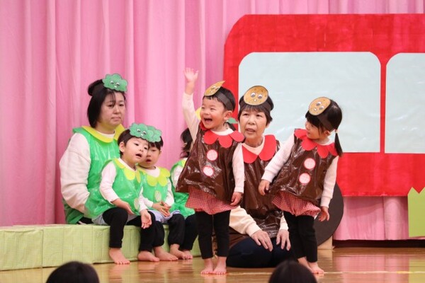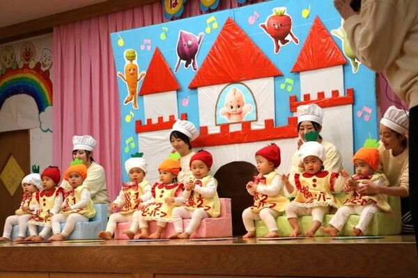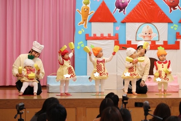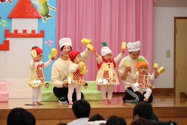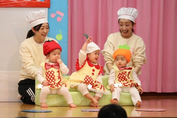 0歳児マドレーヌ組さんは『やさいの国のマドピーちゃん〜愛は食卓にある〜』を披露しました💛