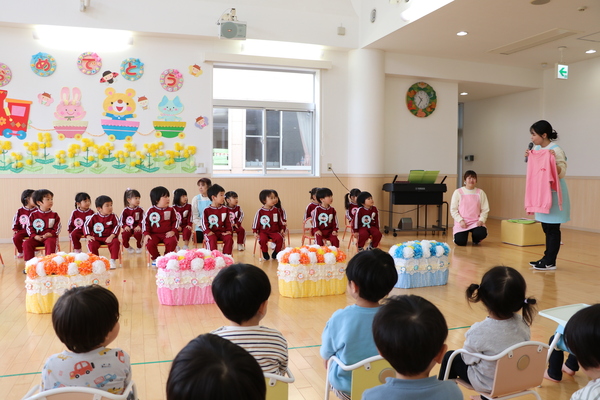 顔写真入りのかわいいコサージュを身に着け、元気よく入場してきたマカロン組さん!ずらっと並んだイスに座ると、お兄さんお姉さんらしくしゃきっとした姿に変わりました!