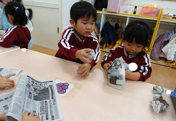 マカロン組では豆まきに向けて、新聞紙を丸めて豆を作ったり、一人ひとりに「どんな鬼さんとばいばいしたい?」と聞いたりして準備をしました。