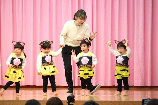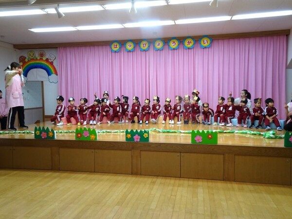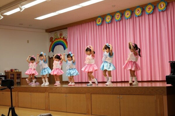 幼稚園の大きなステージでいつもとは違う雰囲気の中、大勢のお客様の前でドキドキしてしまうかもしれませんが、小さな体で一生懸命練習の成果を発揮し、披露します✨