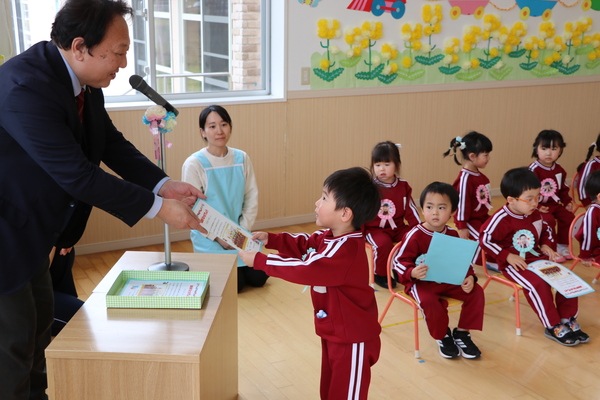 まずはじめに、「おおきくなったでしょう」の証書を授与。1人ずつ名前が呼ばれると、とっても元気な声でお返事をしていました👏演台の前で園長先生から手渡されると、「ありがとうございます!」としっかりお礼を言うことができました!キラキラとした瞳で証書を見つめていた子どもたちでした👀✨