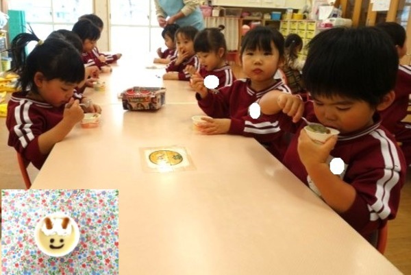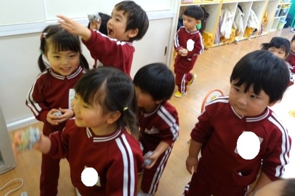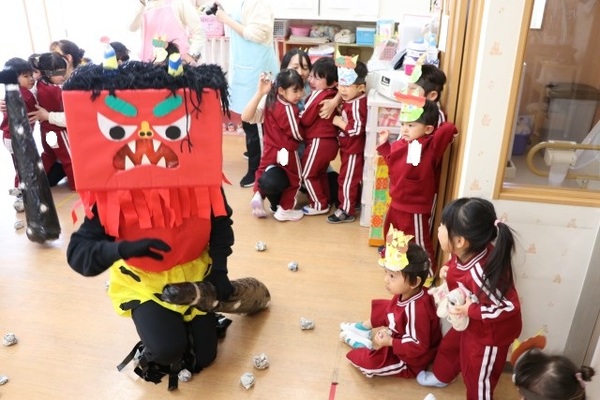 2月3日(火)、自分たちで作ったオニのお面を身につけ、各クラスで豆まきを行いました!