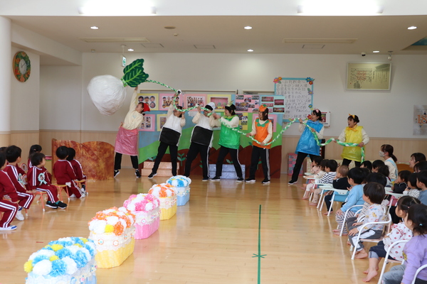 おにぎりさん・なしさん・みかんさん・くまさん・ねこさんたちが登場して勢ぞろい!マカロン組さんたちがマドレーヌ組やショコラ組だったころの写真を持ってきて、保育園での思い出を振り返りました😌なかなか抜けなかった大きなかぶも、みんなのおかげですっぽーん!と抜くことができました(笑)