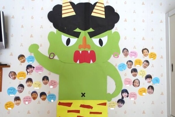 最後には、自分たちで作った豆を「おには〜そと!」と大きな鬼に投げる練習もしました✊