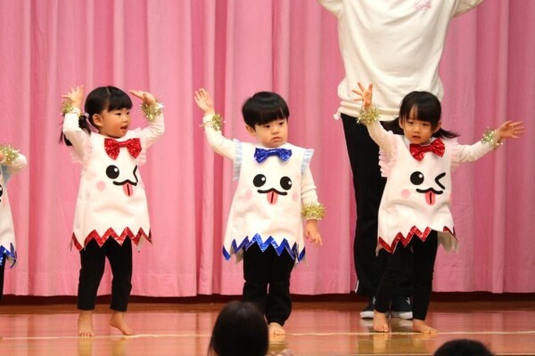 遊戯では、「ドラネコロックンロール🐾」と「おばけのバケちゃま👻」を踊りました!練習でも、「にゃん🐾」「おばけユラユラ〜」と言いながらニコニコで頑張っていました。本番は、少しドキドキしながら楽しそうに踊っていたショコラ組さんでした❣