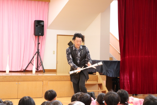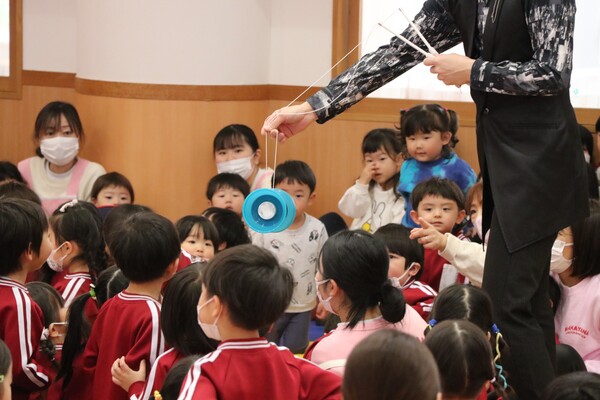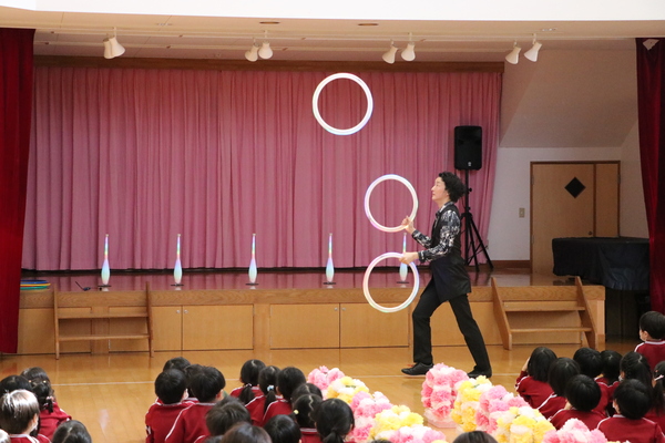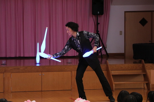 園長先生とマジシャン・カズさんからあいさつがあった後、パフォーマンスがスタート!大迫力のサウンドときらびやかなネオンが織りなす演出に、子どもたちも序盤から目を引く展開に👀次々と数が増えるボールを巧みに操ったり、色が変わるクラブを天高く投げてキャッチしたりと、見どころ満載の内容でした!