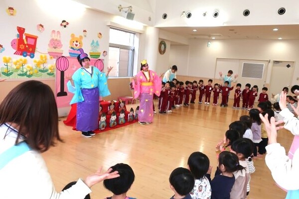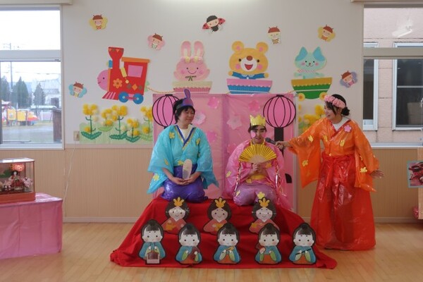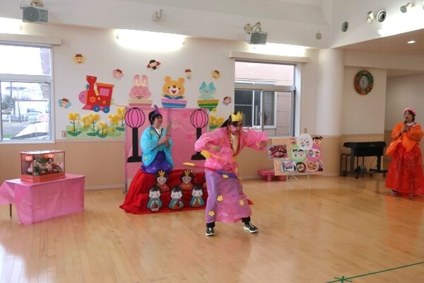ひなまつりの由来や食べ物の話を聞いたり、おだいりさまとおひなさまにインタビューをしたりして楽しみました✨おだいりさまは、「好き嫌いしないでなんでも食べているよ!」と教えてくれ、おひなさまは、得意なフラフープを見せてくれました。