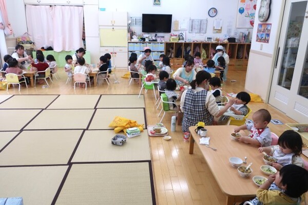 普段とは違う部屋で遊んだり、小さい友だちと一緒に給食を食べたりしている子どもたち💗