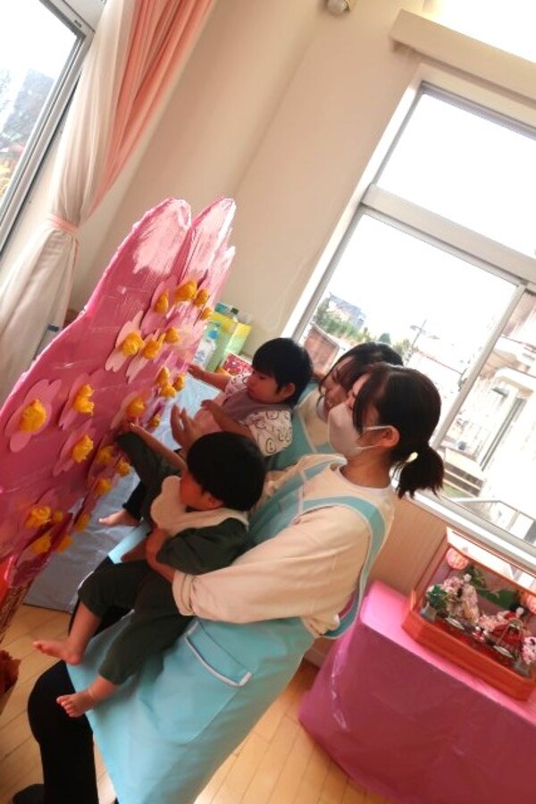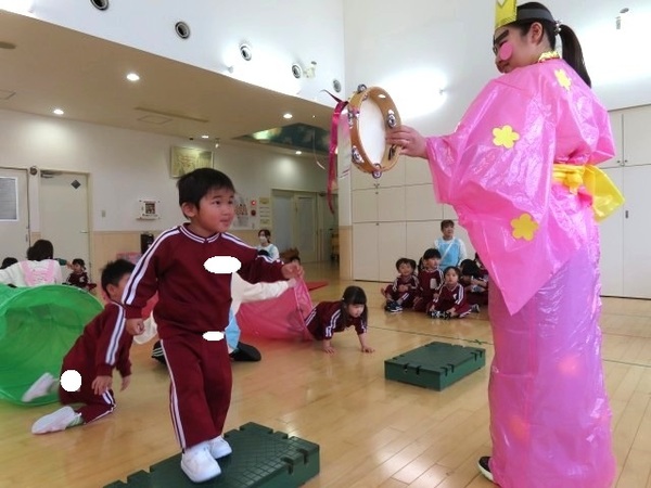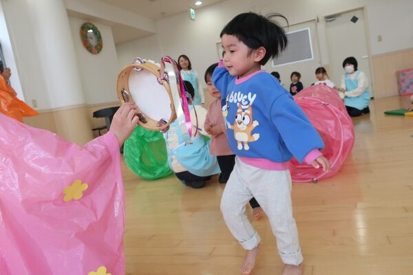 その後は、『うれしいひなまつり』を踊り、桃の花を咲かせるゲームを楽しみました💓トンネルをくぐってタンバリンにタッチし、お花を木にペたん!!