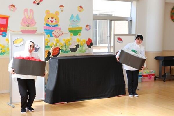エビや玉子、納豆巻きにカッパ巻、そしていくらとしらうおに変身した先生たちが音楽に合わせて次々と登場すると「おっ!」や「きゅうりだ〜!🥒」と喜んで見ていた子ども達でした😊最後には、ケーキを持って改めてお誕生日のお友達のお祝いをしました❣