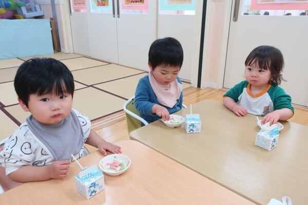 おやつでも「ピンク〜!」「しろだ〜!」と楽しくお話をしながら食べていました😊💛